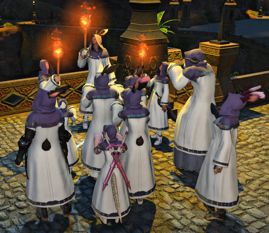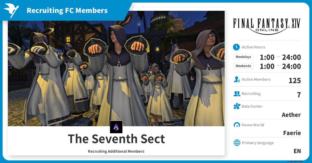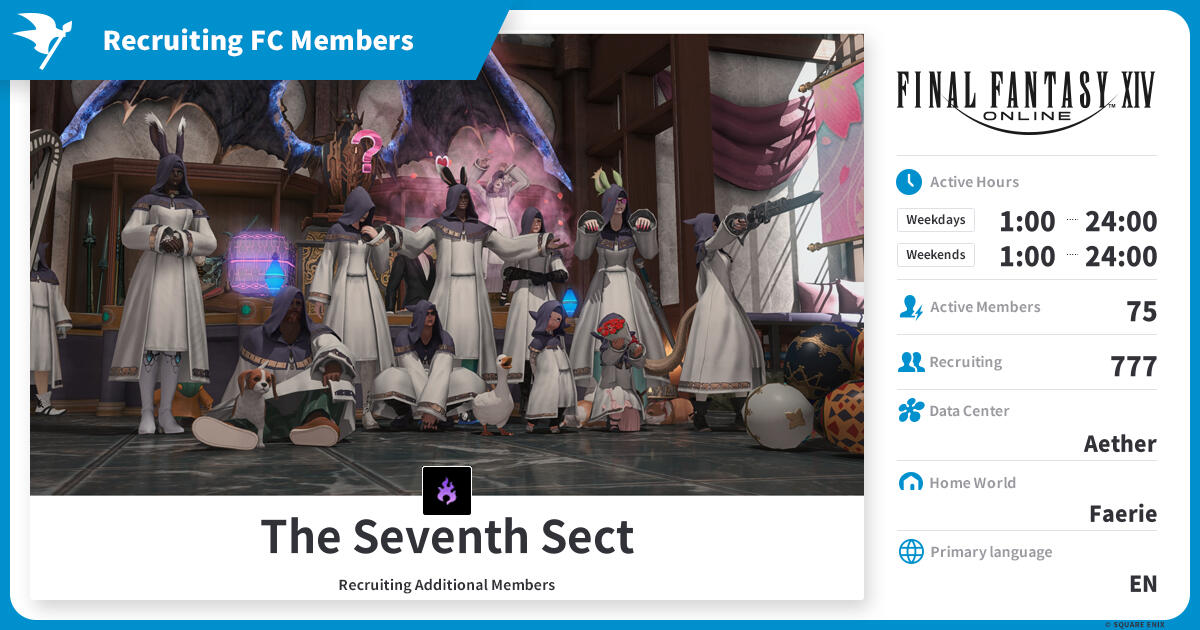 Welcome. You've found Faerie's least suspicious free company!The Seventh Sect is an active free company with 24/7 buffs and a focus on community. We cater to all friendly players who want to get lured into a cult find an active, welcoming group of friends to explore Eorzea with!With members at every level from end-game raiders to sprouts, including returners, newbies, and mentors looking to teach, we're accessible to all.Our leadership team is inclusive, approachable, and has LGBTQ+, PoC, and women in leadership roles. Our members range from 18+ to those in their late 30s. We're committed to maintaining the vibe and keeping it fun!The Sect practices ethical recruitment, meaning all new sacrifices recruits are treated like people and met through conversation and a personal vibe check - never random shouts. We'd love to sacrifice your soul meet you!Note: The rumors about the kool-aid are entirely unsubstantiated.